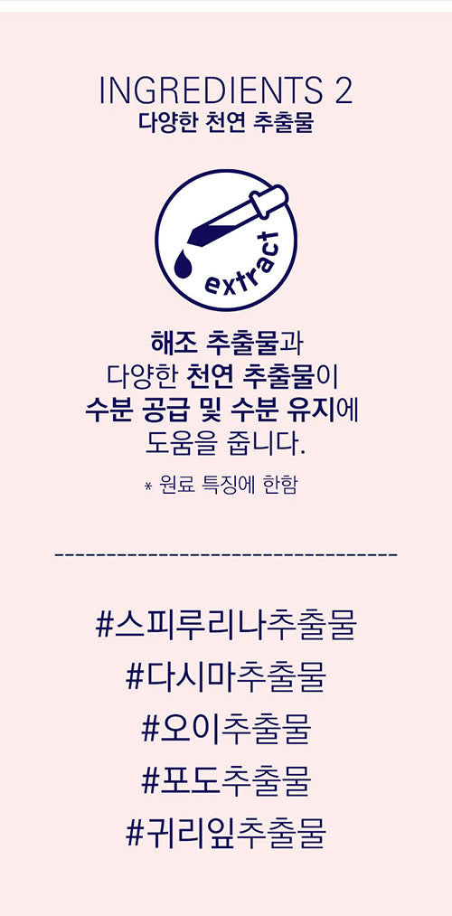 💙또한 천연추출물인 해조추출물과 다시마, 오이, 포도, 귀리잎, 스피루리나 추출믈을 원료에 포함시켜 수분 공급과 유지에 도움을 주고 있어요.