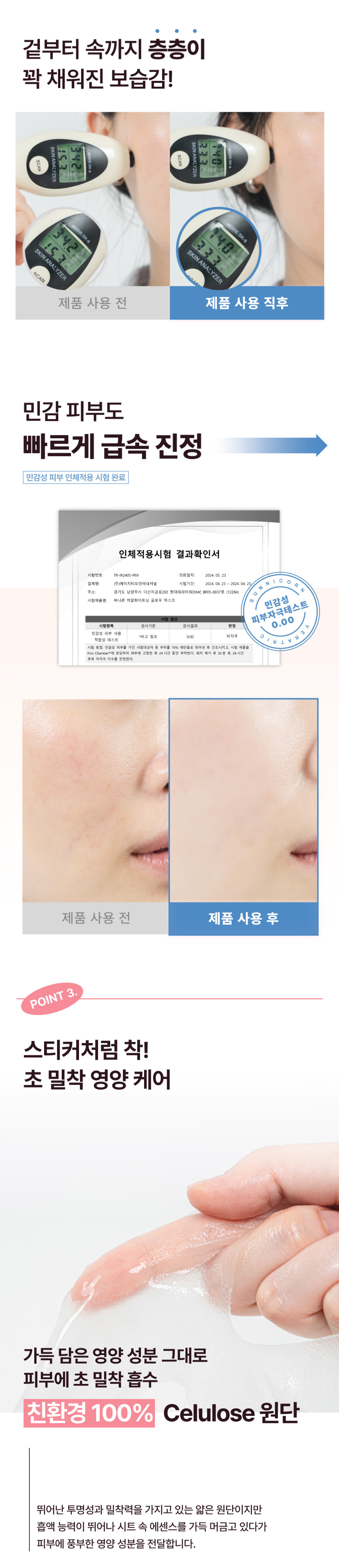 투명성과 밀착력을 가지고 있는 얇은 원단이지만 흡액 능력이 뛰어나 시트 속 에센스를 가득 머금고 있다가 피부에 풍부한 영양 성분을 잘 전달해주고 타사 제품과는 다르게 엄청난 에센스 양을 가지고있어요🫡