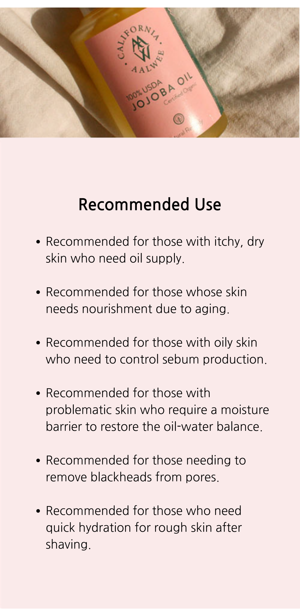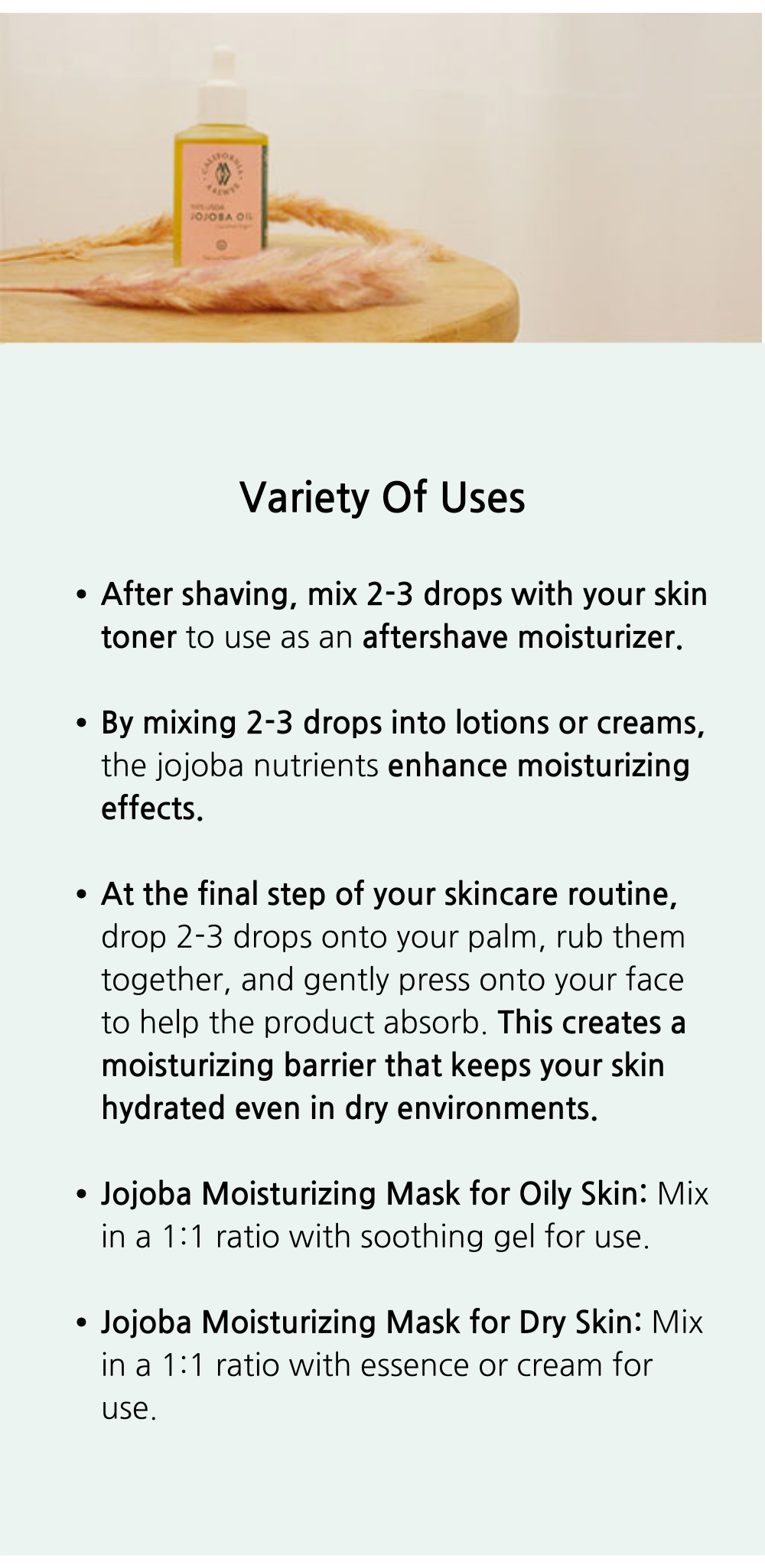 💚 Those with sensitive or acne-prone skin may hesitate to use oil, but the molecular structure of jojoba oil is similar to the skin’s natural sebum. Applying jojoba oil can trick the skin into thinking it has enough oil, thereby reducing sebum production!