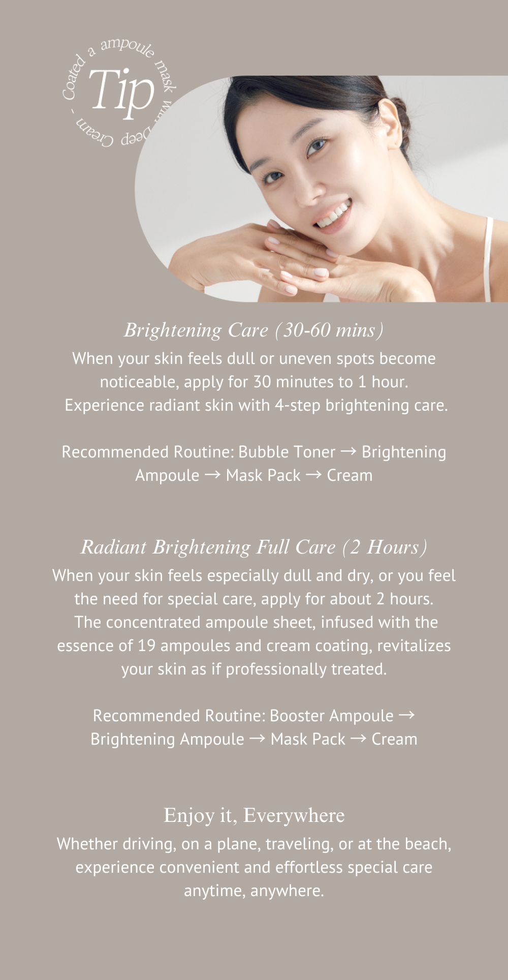 For enhanced results, pair the Glutathione Brightening Mask Pack with Aida Cosmeticโs new Brightening Ampoule. Apply the ampoule first, followed by the mask pack for maximum synergy ๐.