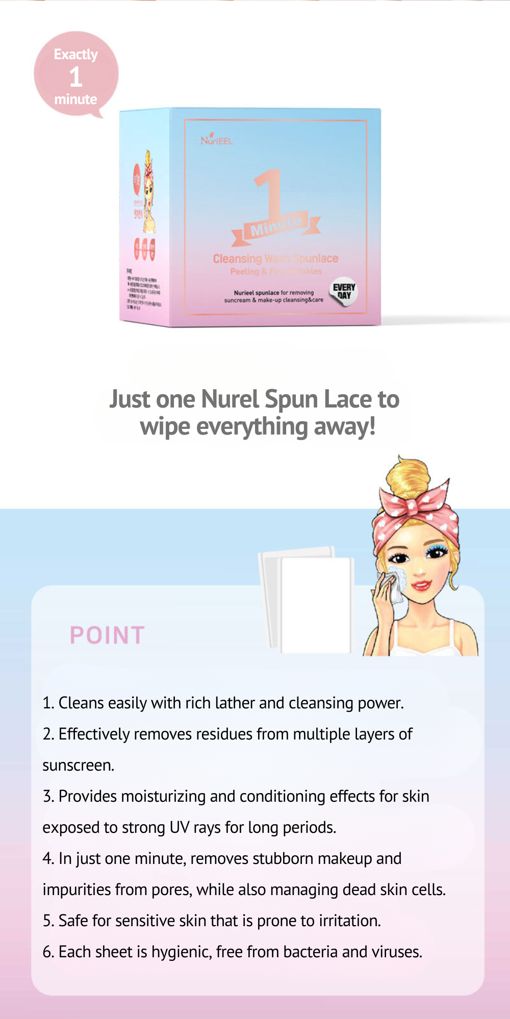 But! With the NuriEl Cleansing Wash Spunlace, you can remove makeup, cleanse, exfoliate, and even manage wrinklesโall with a single tissue!