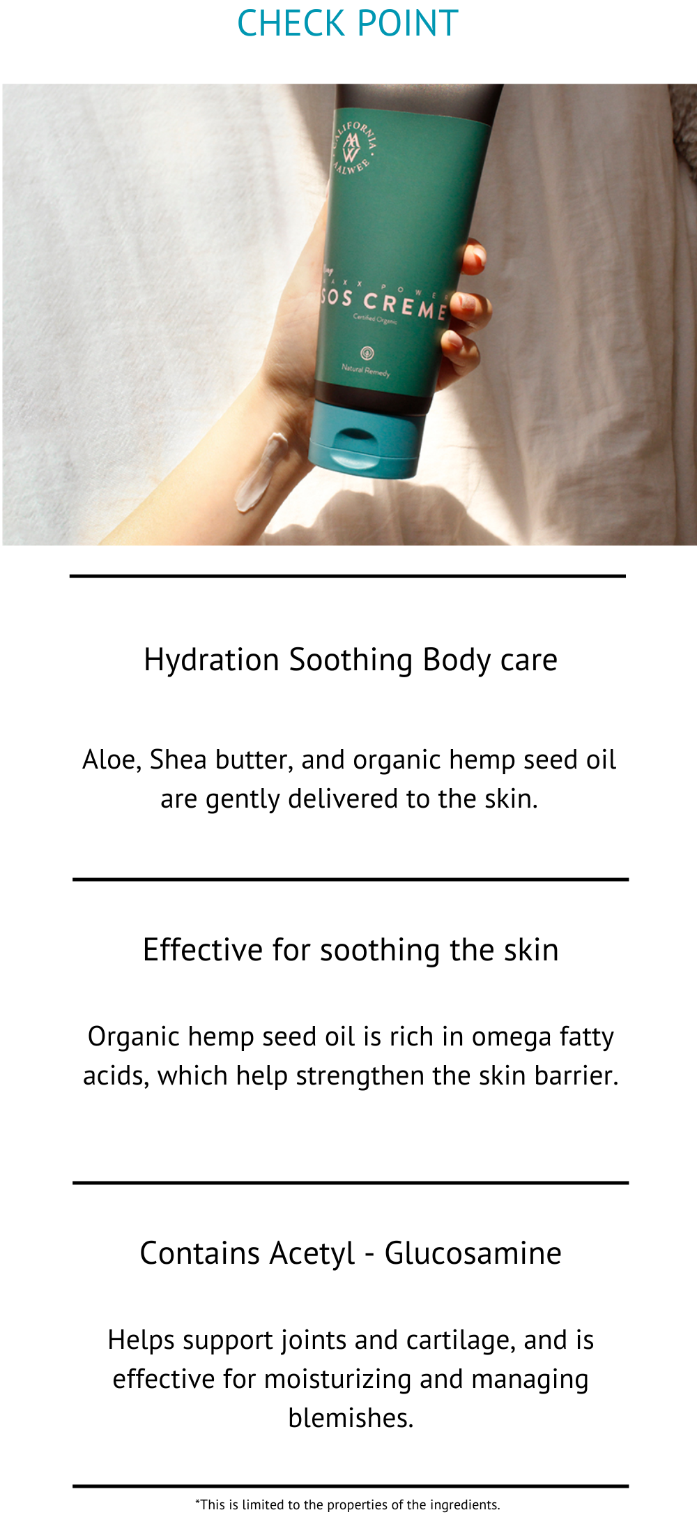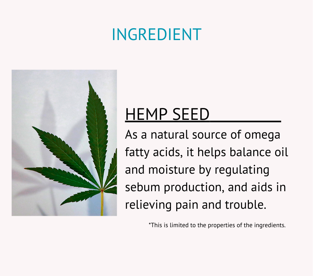 As a source of omega fatty acids, it helps balance oil and moisture through sebum control and contains cannabidiol (CBD) and hemp seed oil, along with aloe, shea butter, boswellia, and acetyl glucosamine. These ingredients provide a cooling, soothing sensation upon application, helping to relieve pain and skin irritation.
