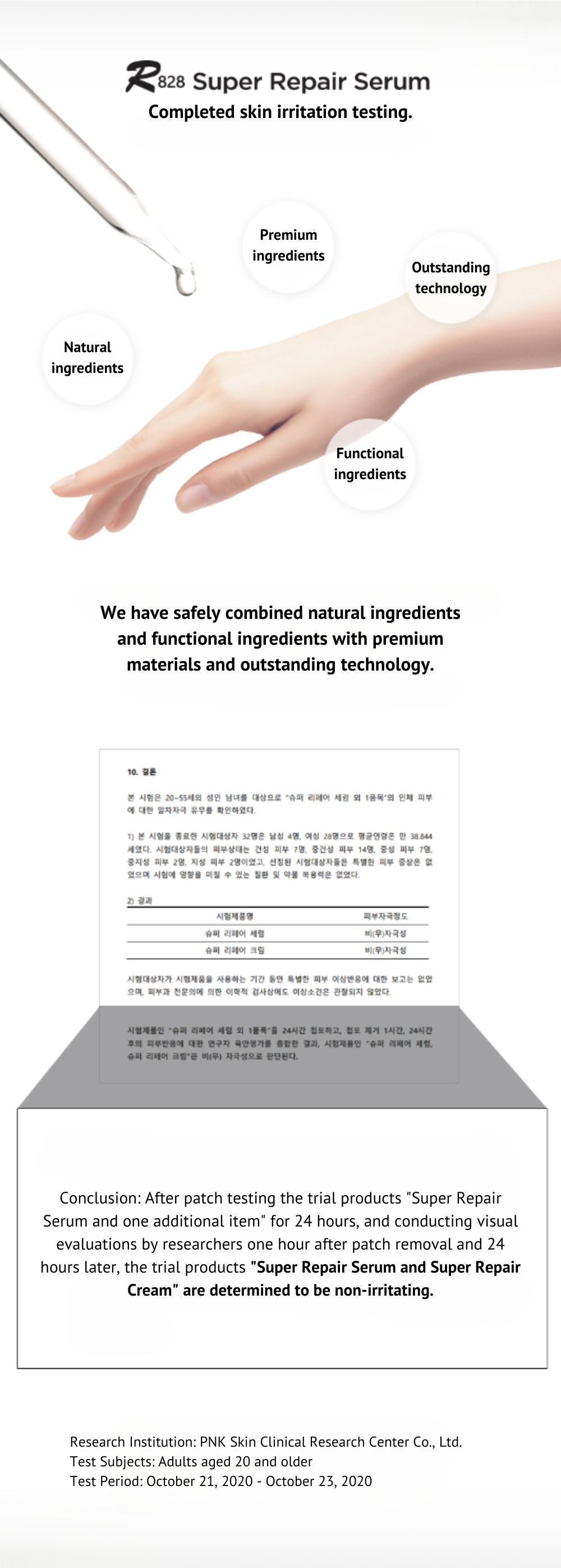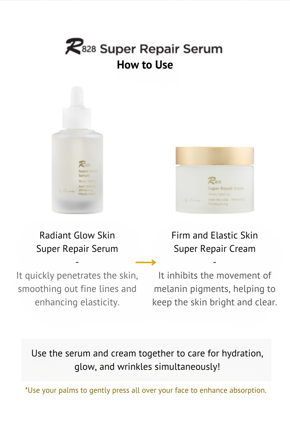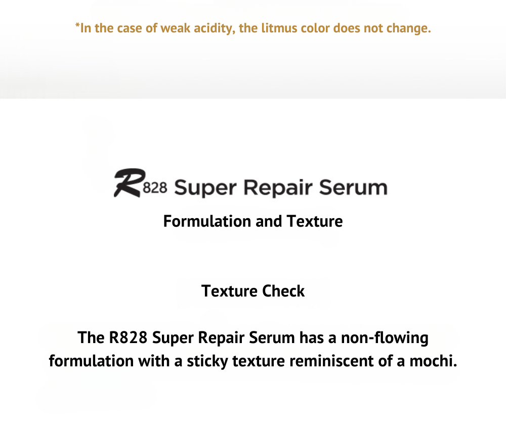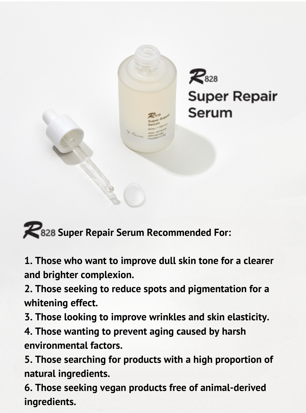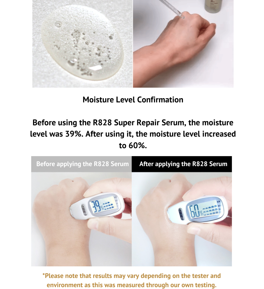 - Unlike typical watery serums that can leave a dry or tight feeling after absorption, the R828 Super Repair Serum envelops the skin instantly, providing moisture without any sticky residue.